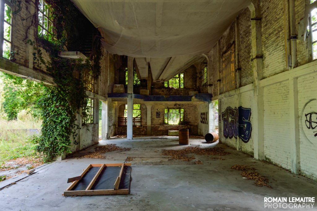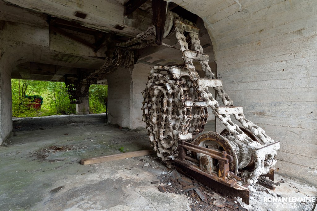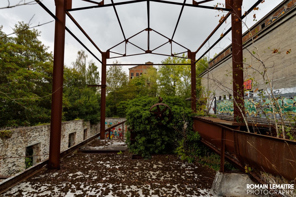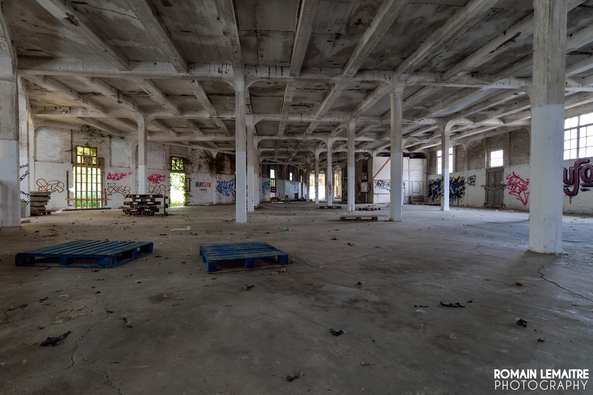Nous continuons notre chemin vers les autres grandes salles, aussi vides les unes que les autres. Il reste quelques rouages, mais plus aucune machine imposante à l’horizon. Cependant, des traces externes à l’activité du site sont encore visible : c’est effectivement un endroit parfait pour des soirées « mondaines » ou des rave parties. Les palettes en bois, placées comme garde corps, nous laisse penser qu’il y a dû avoir beaucoup d’amusements, de rires et de breuvages à flots.