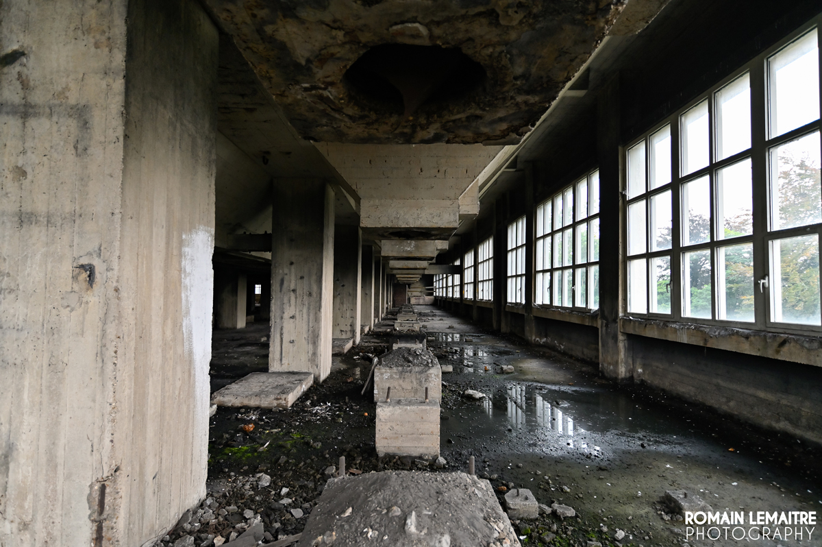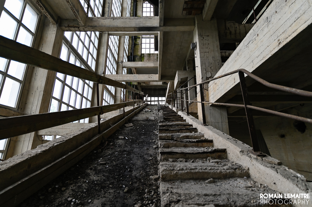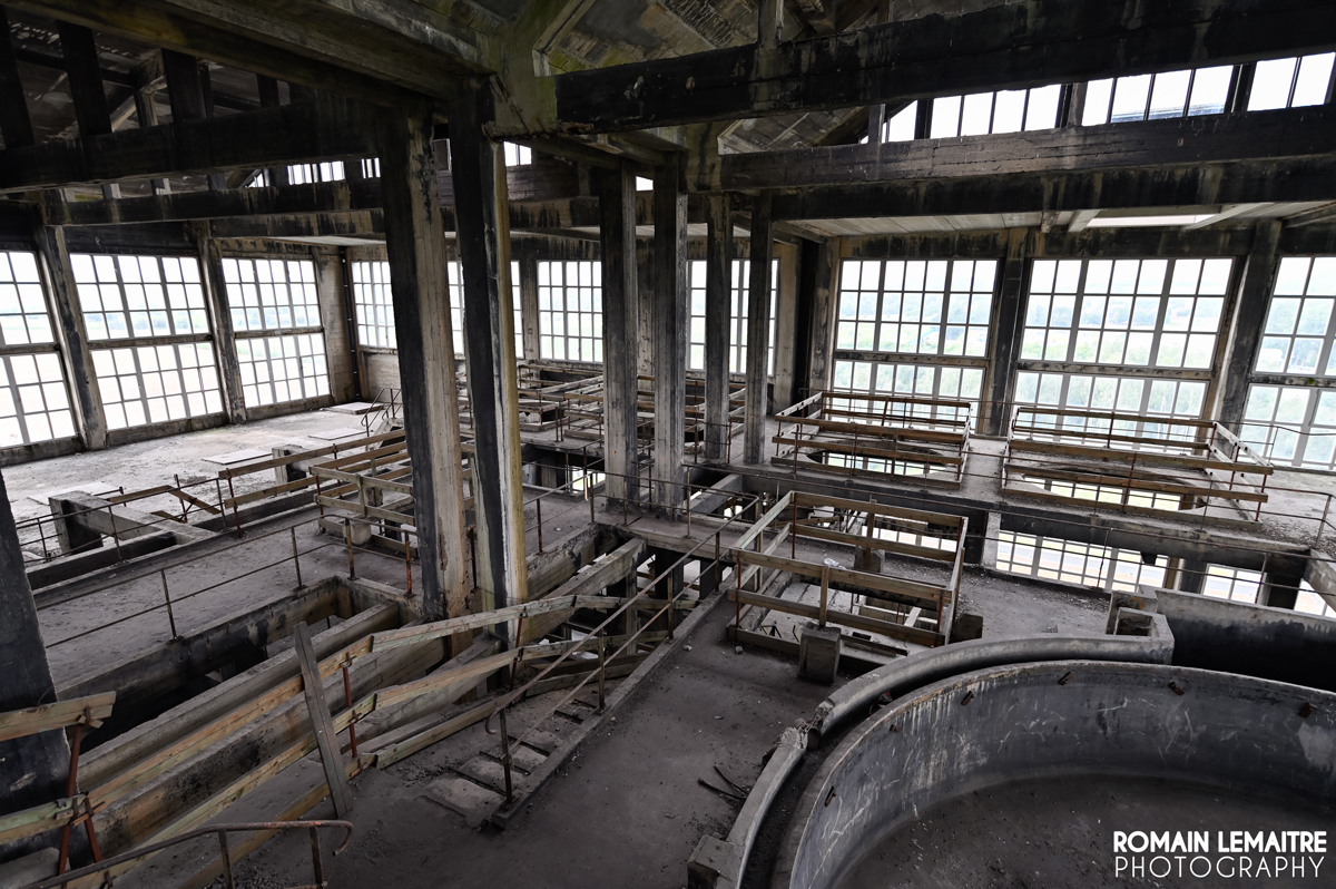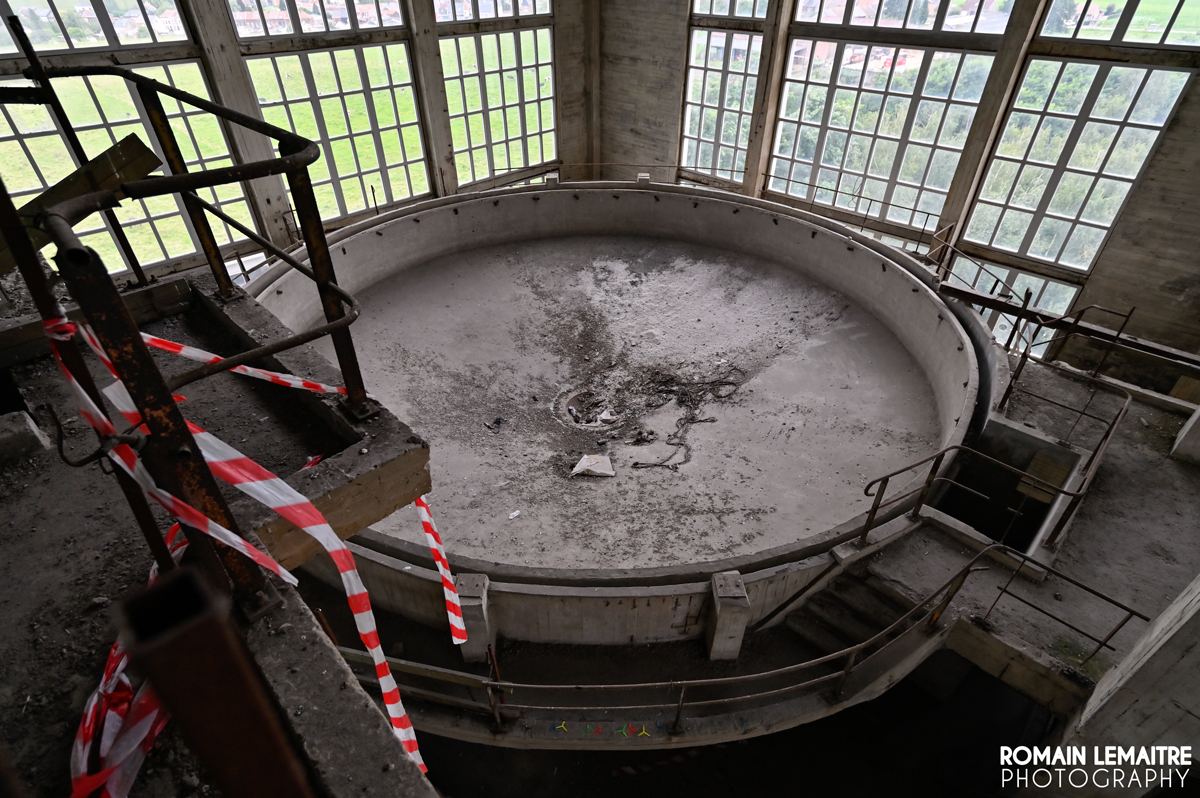 Bien évidemment, nous ne sommes pas venus explorer cette usine par hasard : elle fait partie des structures minières des plus esthétiques, tant dans son architecture que dans sa grandeur. Inauguré dans les années 50, ce bâtiment possède pas loin de 3 500 m² de verrières. A l’intérieur, un emmêlage d’escaliers, à l’image de la Relativité d’Escher, surplombe deux grandes cuves d’environ 12m de diamètre, de quoi traiter 3 000 tonnes de charbon quotidiennement. Les constructeurs ont certainement voulu exposer leur puissance économique à travers « ce château de béton et de verre ».